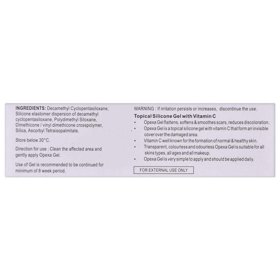 Say goodbye to stubborn scars with Opexa Advanced Scar Treatment Gel, a dermatologist-recommended silicone gel enriched with Dimethicone and Vitamin C (Ascorbyl Tetraisopalmitate). Specially crafted to flatten, soften, and lighten scars, this transparent, quick-absorbing gel forms a protective layer that locks in moisture, supports skin repair, and improves overall texture — making scars less visible day by day.